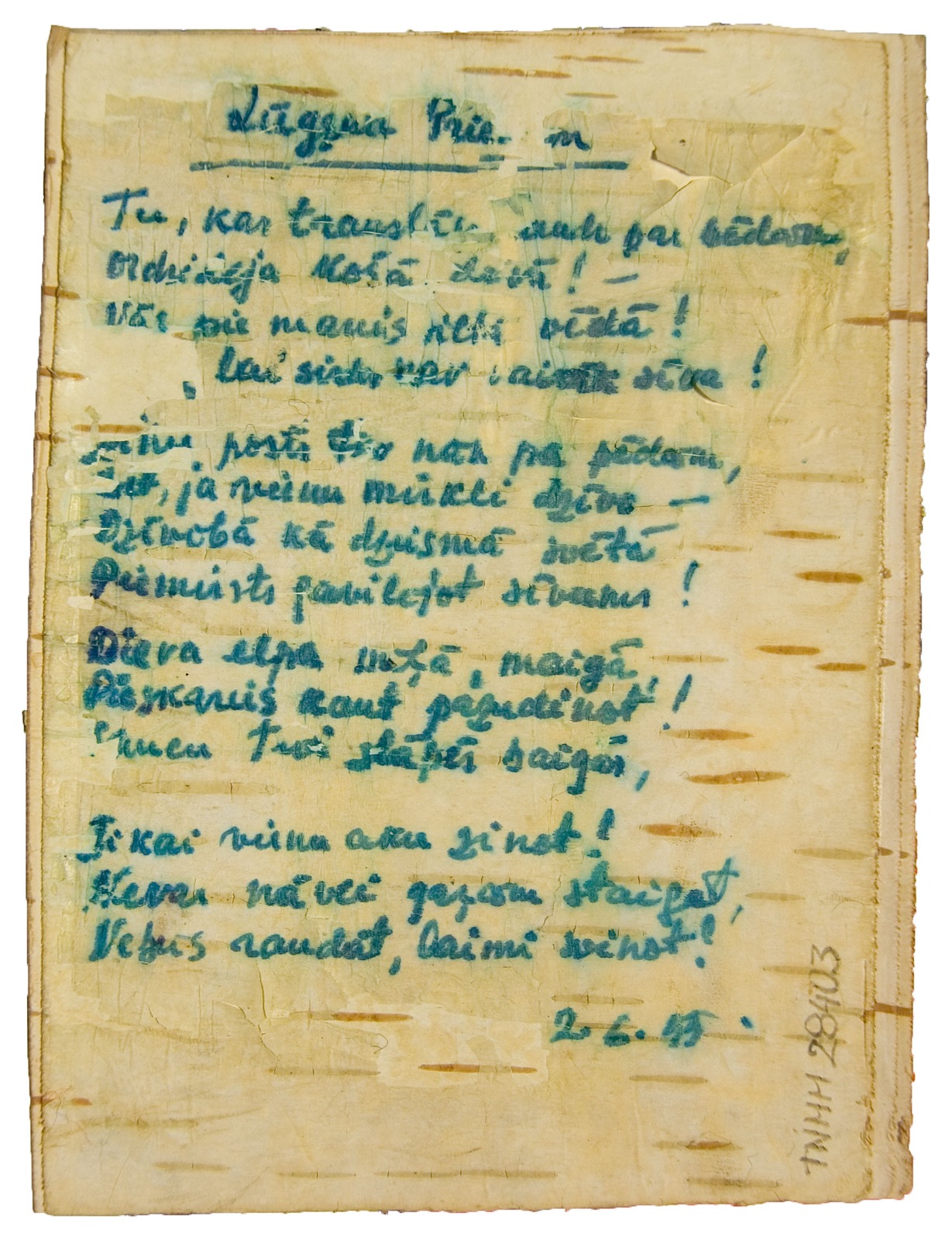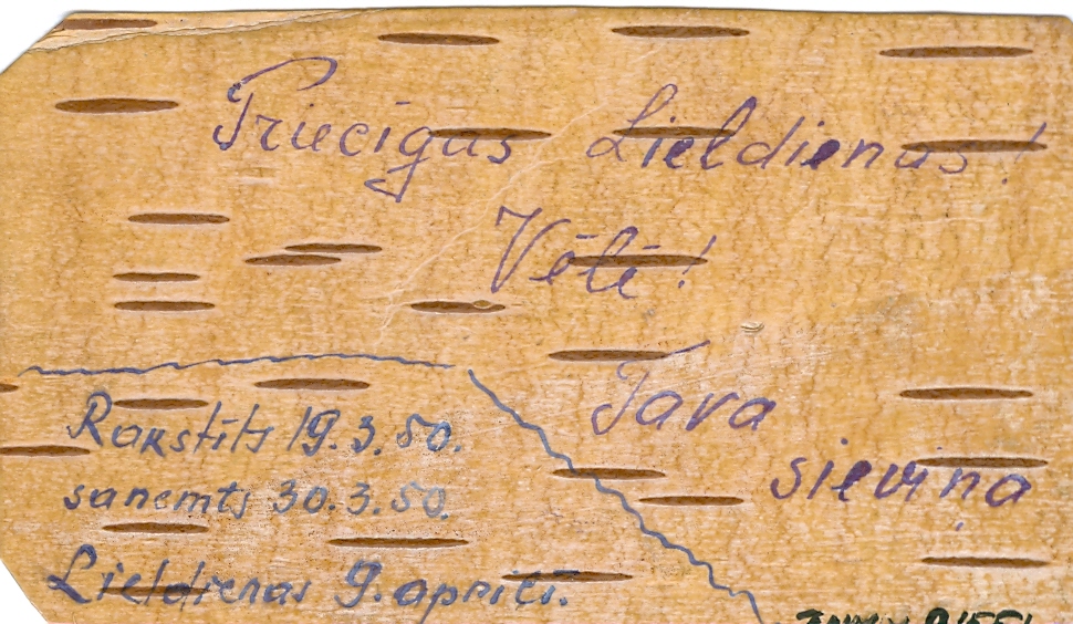 TNMM-21551 ir laikraksta „Talsu Vēstis” bijušā korespondenta Voldemāra Vadziņa dāvinājums – apsveikums uz bērza tāss. To sūtījusi viņa māte Lizete Lūcija Vadziņa – Vāciete (1920-2002) no izsūtījuma Sibīrijā, Tomskas apgabalā, vīram Kārlim (1908-1981) uz cietumu Komi 1950. gada Lieldienās.