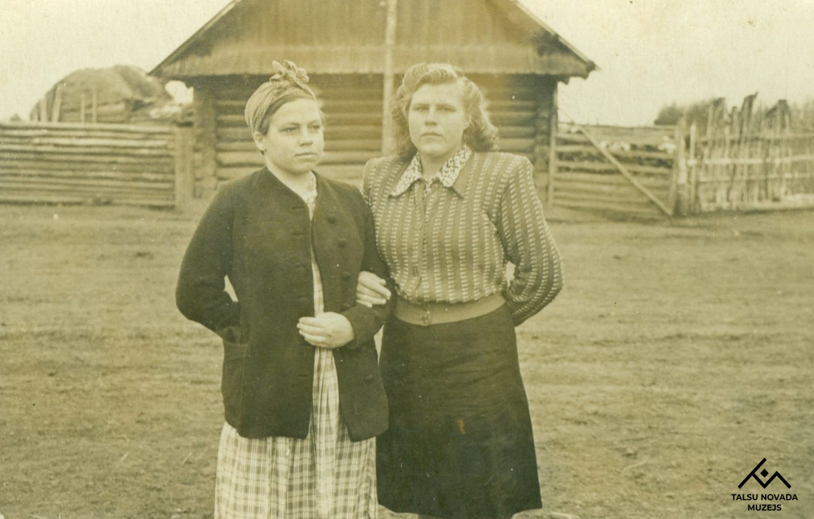 Attēlā: L. Leja ar māsu Elgu Leju pie savas mājas Sibīrijā, izsūtījumā, 1955. gads. TNMM 20797