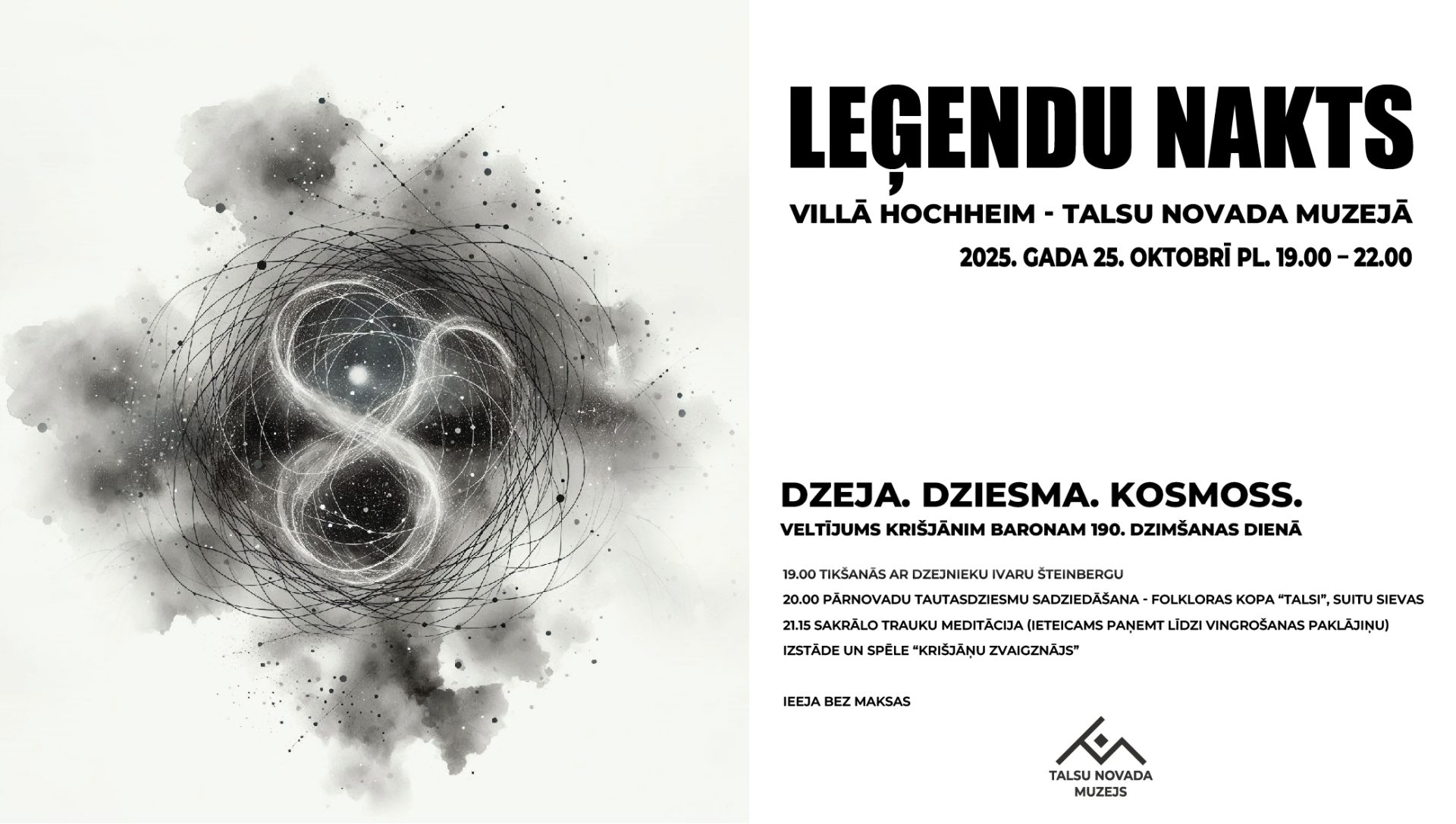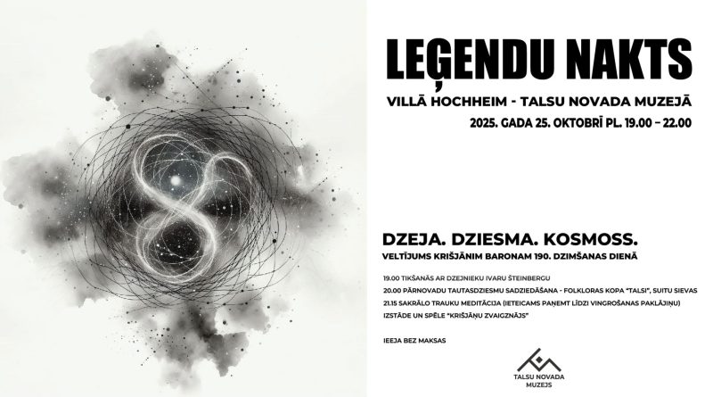 Talsu novada muzejs 25. oktobrī, no plkst. 19.00 līdz 22.00 aicina uz Leģendu nakti “Dzeja. Dziesma. Kosmoss”, veltītu Krišjāņa Barona 190. dzimšanas dienai. Vakars Villā Hochheim būs piepildīts ar dzeju, dziesmām un īpašu noskaņu.