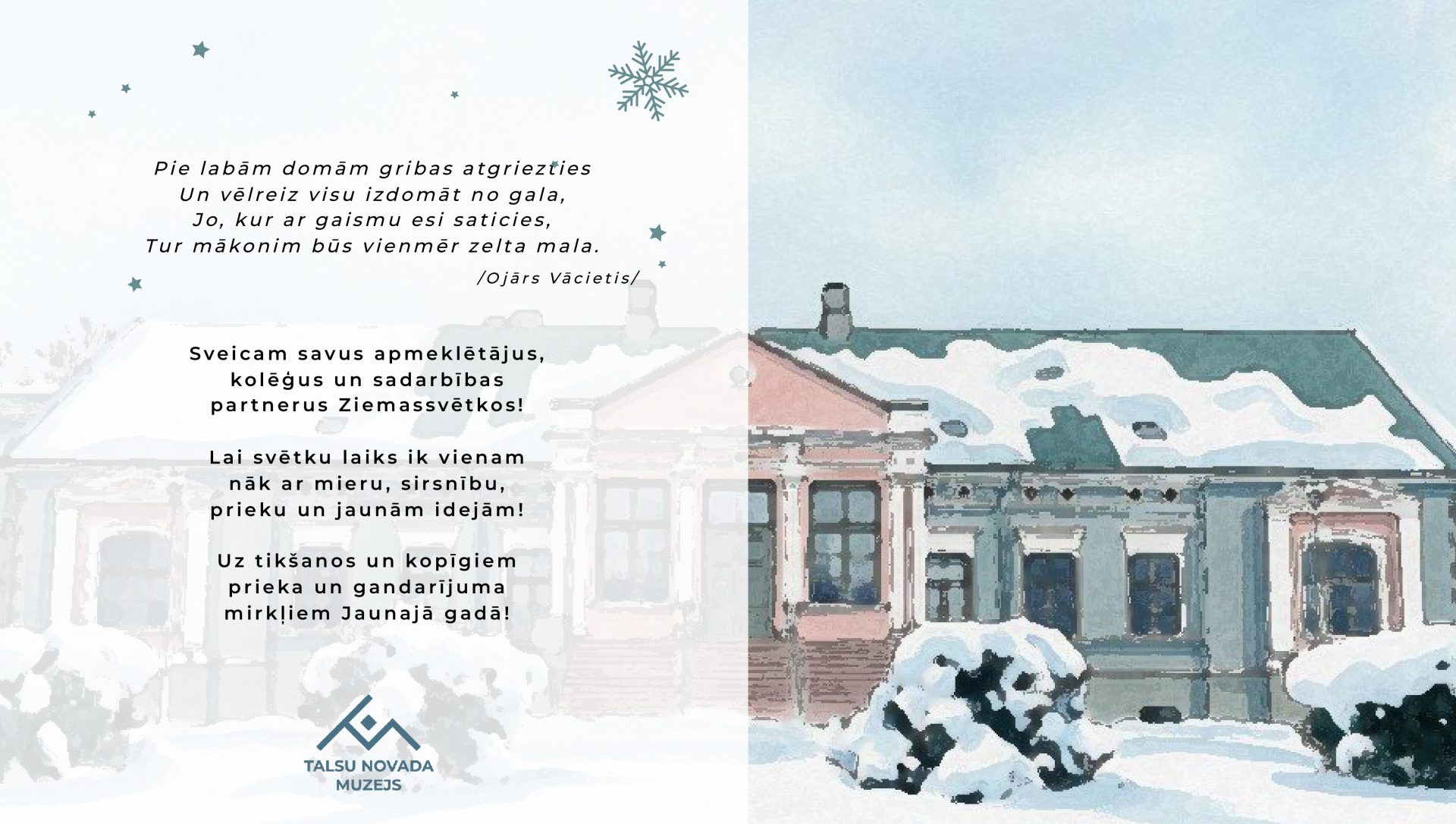 Lai svētku laiks nāk ar mieru, sirsnību, pārdomām un iedvesmu jaunam sākumam. Paldies ikvienam apmeklētājam, kolēģim un sadarbības partnerim par kopā būšanu šajā gadā